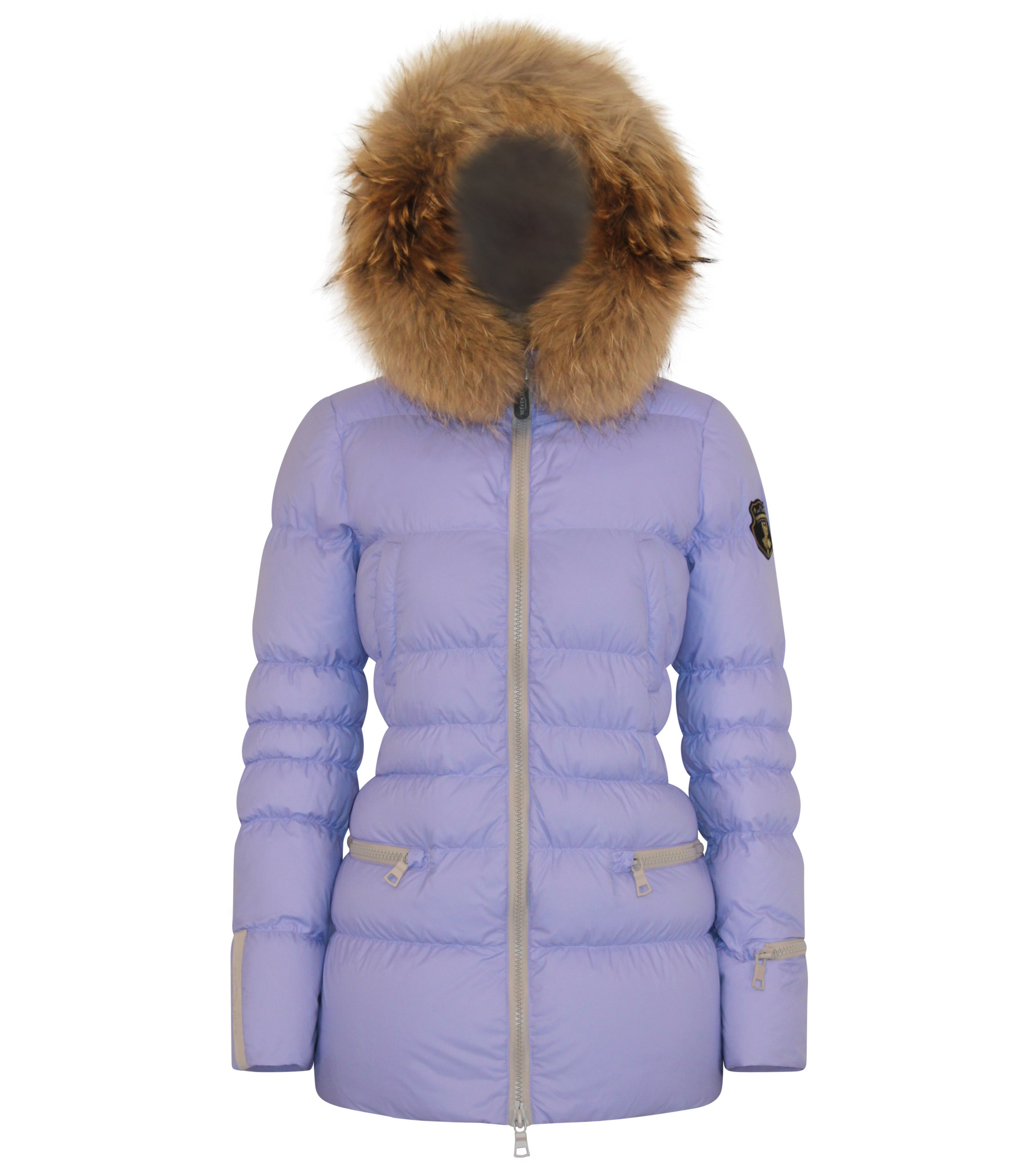 - Fixed hood with detachable fur trim
