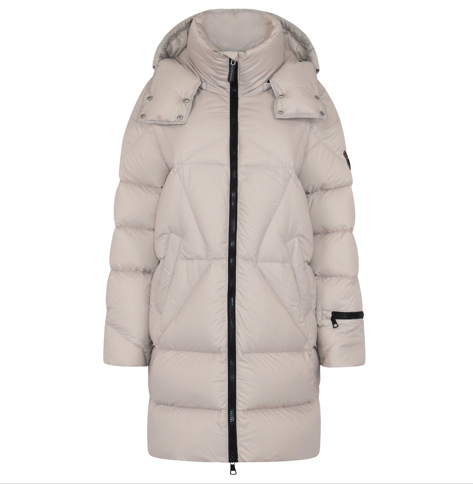 This fashion forward, oversized down coat showcases an eye-catching stitching pattern. It is a bold fashion piece featuring large grid quilting, contrast color lining and a detachable hood. It is a warm and comfortable way to make a fashion statement during the winter months. This is the most comfortable down puffer, check it out!